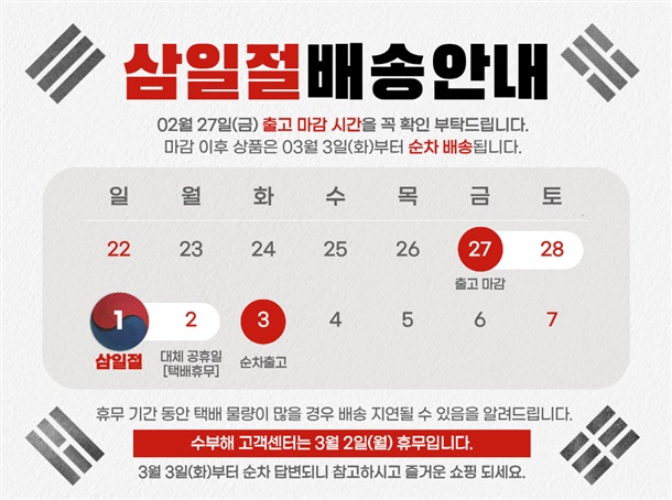 - 택배 도착시간은 지역마다 배송 기사님의 스케줄로 인해 다를 수 있습니다.
